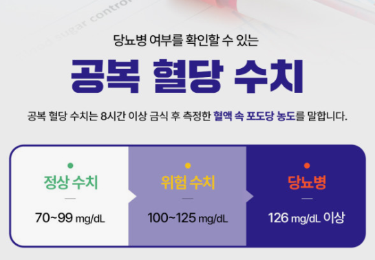 | 당뇨병 진단 | 126mg/dL 이상 | 당뇨병 확진 가능성 높음 |