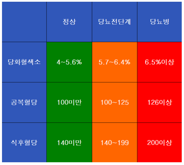 | 당뇨병 | 6.5% 이상 | 당뇨병 확진 가능성 있음 |