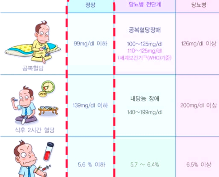 - 5.7~6.4% 당화혈색소: 당뇨 전단계 가능성