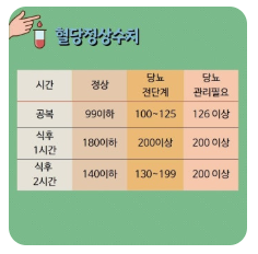 - 식후 1시간 혈당 정상수치: 180mg/dL 이하