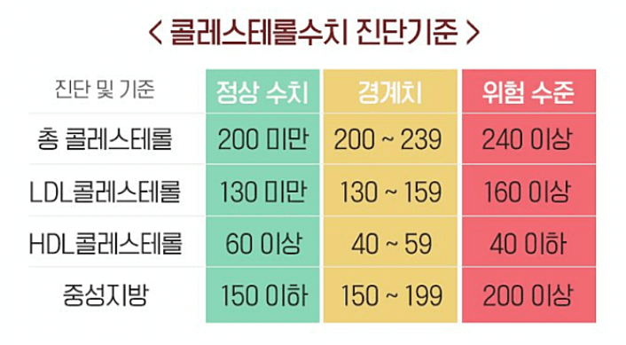 | 정상수치 | 총콜레스테롤 200mg/dL 이하 |