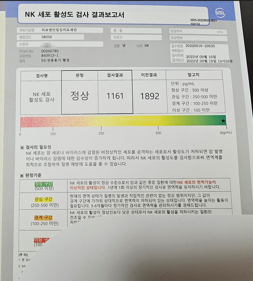 - 심각한 저하 (100pg/mL 미만): NK세포 기능 저하 상태. 전문의 상담 필요.